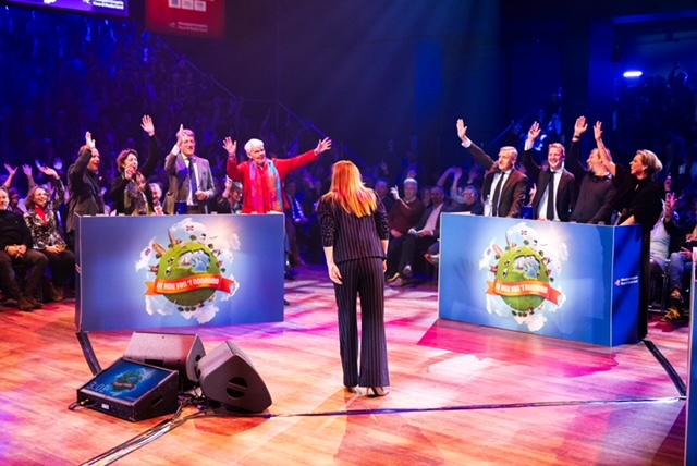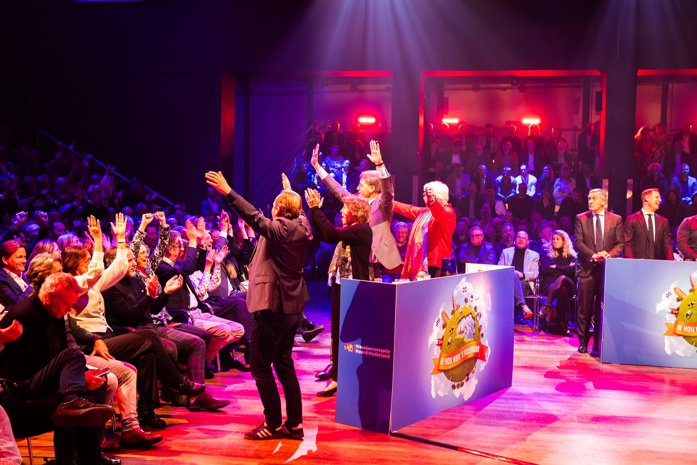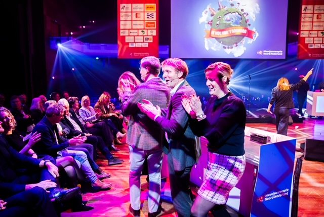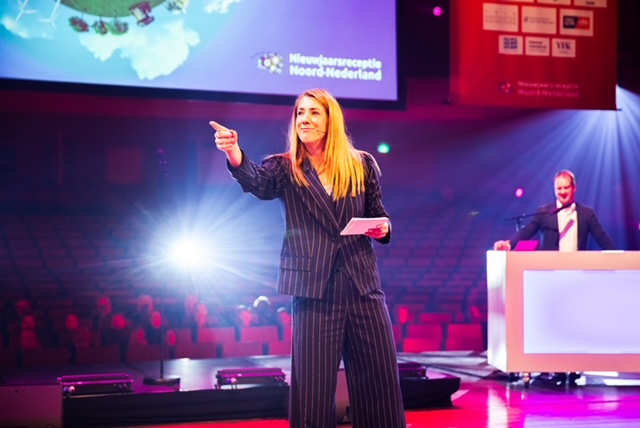 Normaalgesproken host deze dagvoorzitter inhoudelijke events, congressen en symposia maar als Bram Nauta je vraagt een quizzzz te presenteren op dé Nieuwjaarsreceptie Noord-Nederland dan haal je onmiddellijk je glitterpumps van stal. Martiniplaza was voor de gelegenheid omgebouwd tot TV studio, inclusief tribunes óp het podium voor het prachtige publiek.